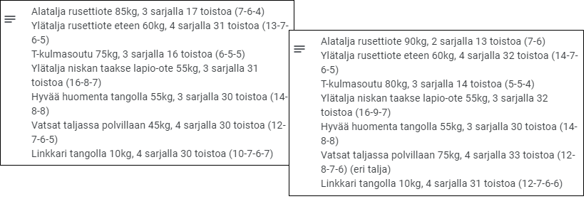 Kuvasta selviää, että penkissä tosiaan jouduin tiputtamaan kuormaa parin sarjan jälkeen, koska toistomäärät olivat niin pieniä ja ehkä vastuskin vähän turhan raskas minulle. Seuraavalle kerralle tietää ottaa astetta pienemmän kuorman, jolla ruvetaan sitten takomaan enempi toistoja ja toivottavasti saadaan hommaa vietyä eteenpäin sitä kautta.